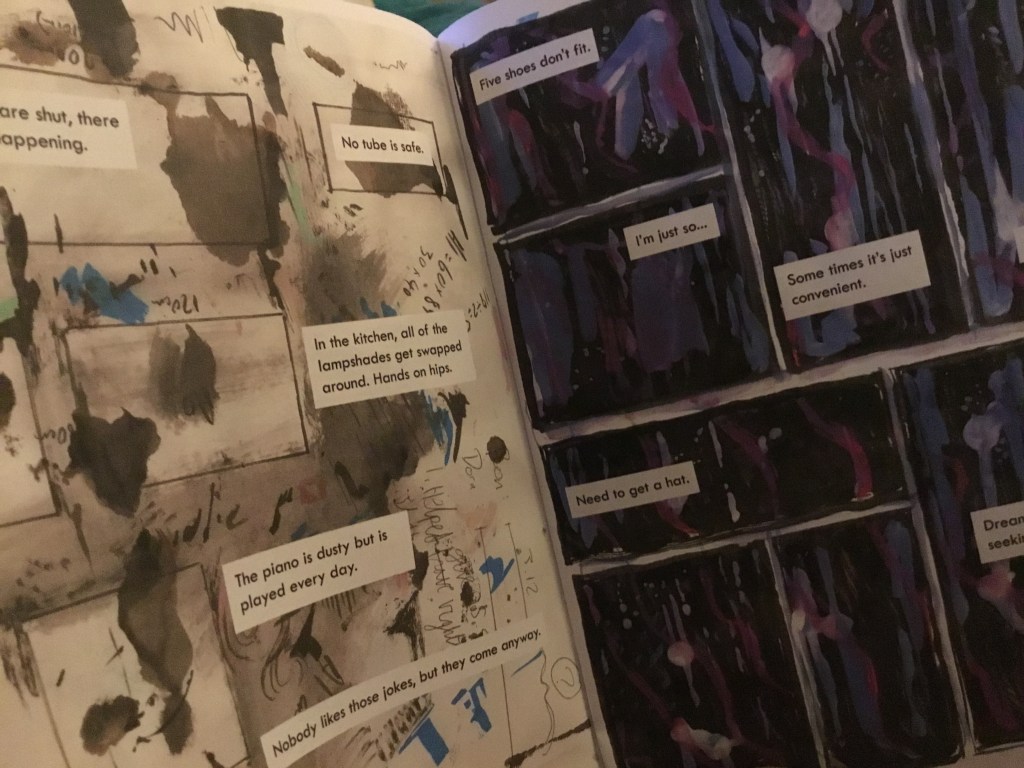 But Hopkins retains that ephemeral moment and releases it onto a page of what is often pure abstract art but occasionally something that forms into a recognisable image. There are faces and creatures in this book. But occasionally literally, as page three shows us a ghostly image of the artist himself. He speaks of noises that evoke contemplations of uncompleted stories but also simultaneously makes us question the nature of our own and the author’s memory. I wonder what prompts these thoughts and if I have gained an insight into the mind of the artist here?