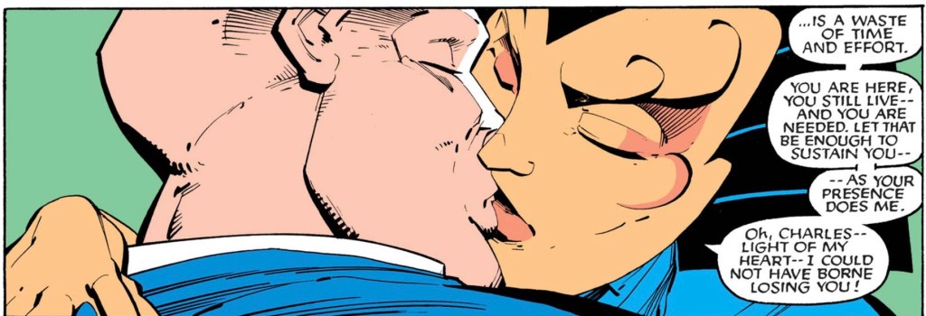 Tony finds himself confused by not only that sly look back from Rogue but also her flirtations with Ronald Reagan (genuinely). The boys also wonder at the parental abilities of Scott and Madeleine. He doesn’t really seem committed to fatherhood and Maddy hands her baby over to a psychic who uses her powers to investigate when potty time arrives!