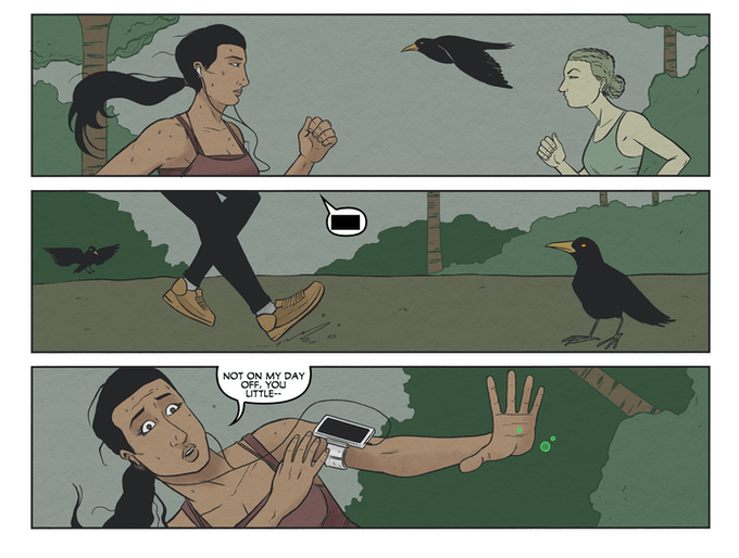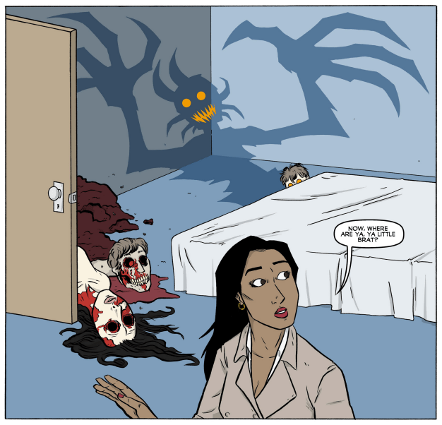 This is a supernatural/procedural comic that is split into two stories. Although this may not be immediately obvious on an initial read through as they do fit together seamlessly. These tales provide a decent introduction to the burned-out mystical detective Constance ‘Connie’ Dhar. She is casual in the extreme when presented by a child who is possessed and is more interested in getting off work on time. She is distinctive and likeable in a Millennial/Columbo way. She is also rude and possibly somewhat lazy but gives out the confident manner of a knowledgeable veteran of the squad.