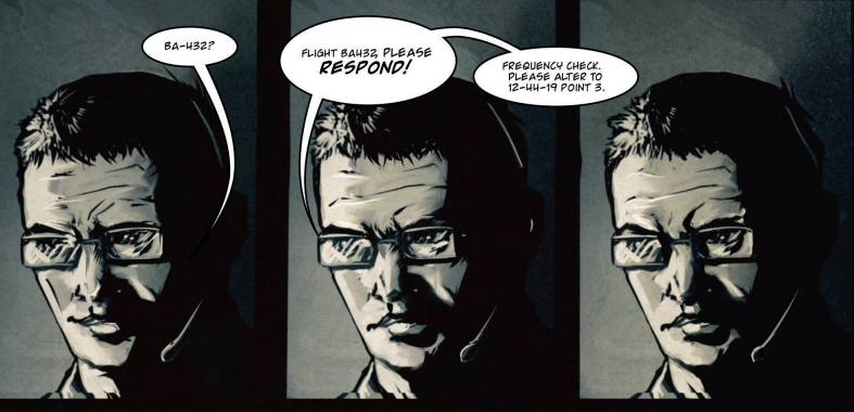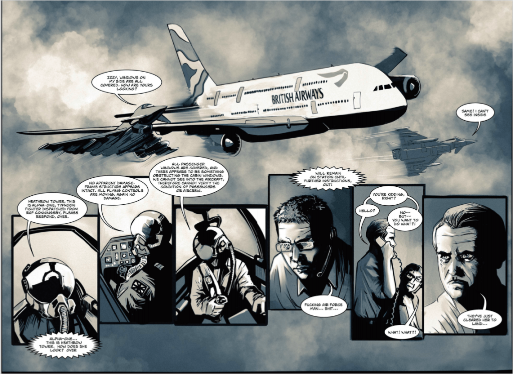 The pacing moves away from the comics traditions of showing action regularly in a comic and can be seen to have been crafted against episodic televisual stylings in building tension. That plane really did take ages to land/crash. It leaves the questions of who was flying it etc? (I’ve checked and BA432 actually exists and travels from London to Amsterdam on Sundays).