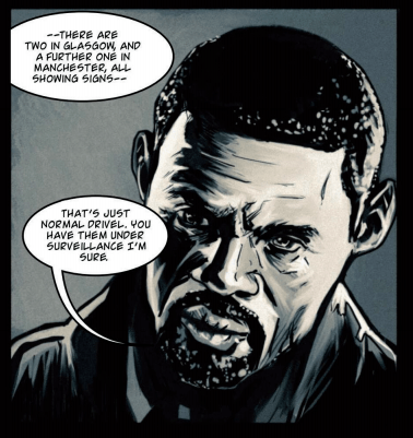 Good old reliable Idris Elba turned up. He’s just finished his most recent Sky TV advert and has taken a break to help out these scientists and all those artists using him as reference. ‘Not again’ you could hear me saying. There’s a recognition element to the use of well-known actors and the like in this way that immediately takes you out of the story. This happened to me right here. I sent a screenshot to a buddy who straightaway asked me why Idris Elba was in this comic.