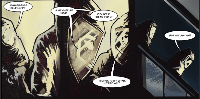 This series sets out to establish a wide cast. In some sequences we get some great character moments. For example there is a scene on a plane where a young girl speaks to the pregnant woman in the seat next to her. It’s well written and realistic and creates character that you will remember later. But when setting up a large cast you need to establish who is who and what they do/are etc. There are far too many under-rendered panels where the faces are obscured or are lacking any specific detail/characteristics.