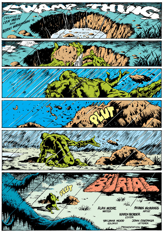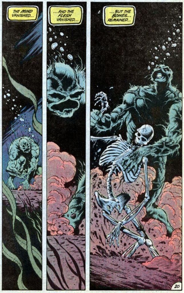In this story the foul rotting and fly-infested nightmares are paused for an introspective episode. Swamp Thing strides out through his environment and takes control. He buries his past along with his uncertainty and shows that he can progress in his role as the guardian of this world. This is great writing by Moore where he makes use of narration to tragically chilling effect.