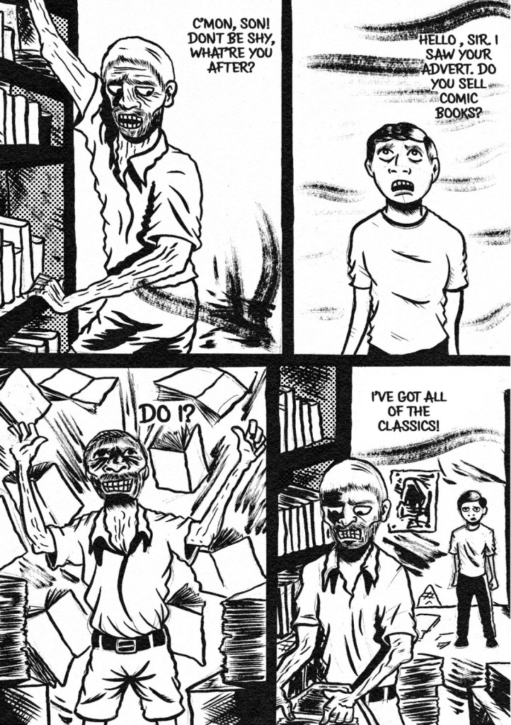 Adam Falp joins Tony to talk about his new issue of Satan’s Library. He has recently reworked and redrawn an older published story that was inspired by his tour of American comics shops and the very different community/shopping environment they create compared to shops in the UK. This has just been released and features a wraparound story of a boy visiting a shop whilst the comic also contains the smaller sown into the book versions of the comics he reads and buys there. Adam talks about his approach to this comic within a comic and the verisimilitude of creating three faked realities in a single volume.