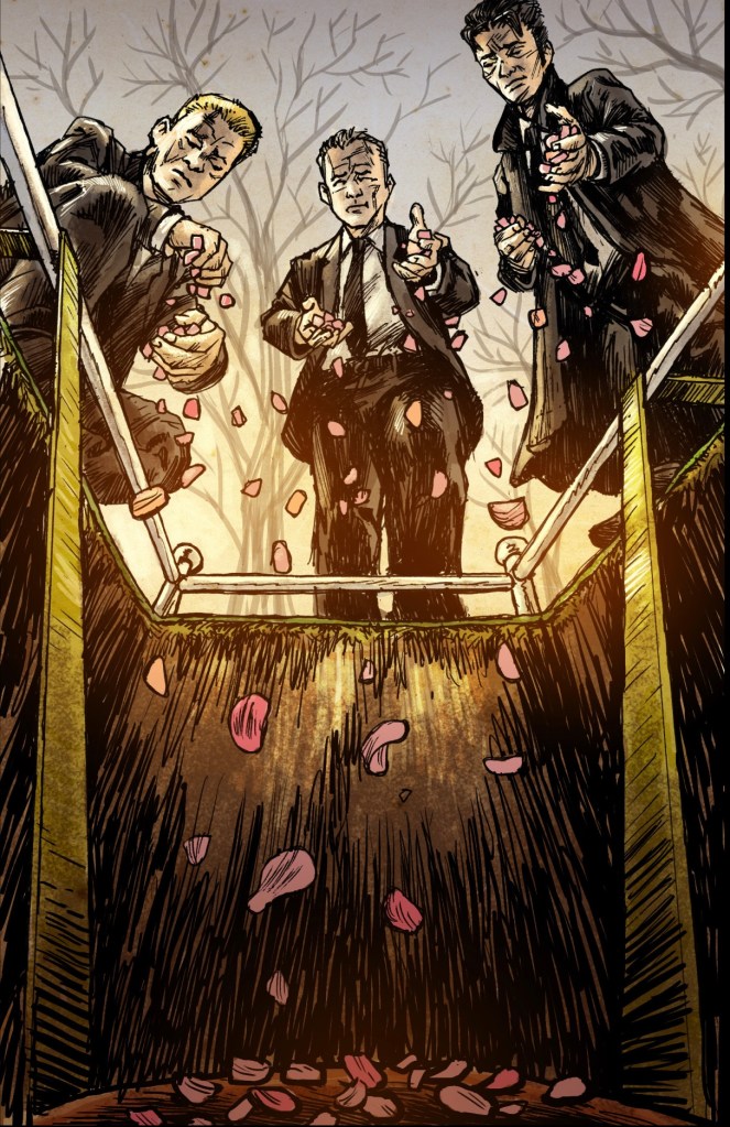 This first issue is fair length at forty-nine pages and over twice the length of an average Marvel/DC comic. But there isn’t that much going on. The pacing feels so much more like the first episode of a television series in the building of back story and the laying of upcoming twists and turns. It dwells too long in wide shots and the back and forth of diner/office/cemetery discussions. It also leaves the reader with a handful of plot moments at the end that are presumably dealt with further down the line. The lack of comics storytelling knowledge is also on show in the lack of credits and their strange cover copy font sizes. We also see a rather awkward set of head shots and film credits on the last page using terms like ‘accomplished screenwriter and playwright’ or ‘Award winning writer, director, and producer who studied at NYU, UCLA and University of London’. We also bizarrely get details of their hobbies (swimming and golf if you are interested) but barely more than a single mention of comics! Oh hang on, one of them does mention ‘Graphic Novel’.
