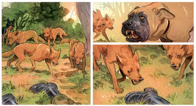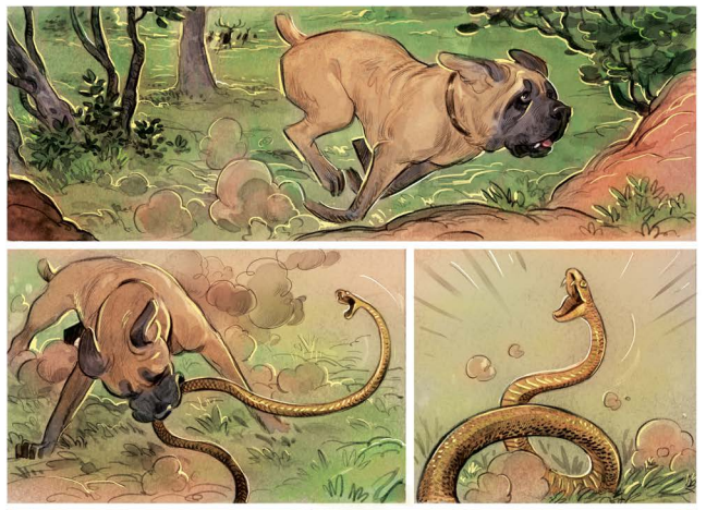 The Cover – The cover of the Mastiff hero is gorgeous and immediately eye-catching. It’s worth noting that the only link to humans in this volume (ish) is the collar on the dog, which was a fun touch. This cover also tells a story and at the same time shows the reader an example of the glorious painted artwork inside. The graphic design is simple and the two credits and title don’t crowd the artwork. You only get the Magnetic Press logo on the back of the book and this keeps that image clean and fresh.