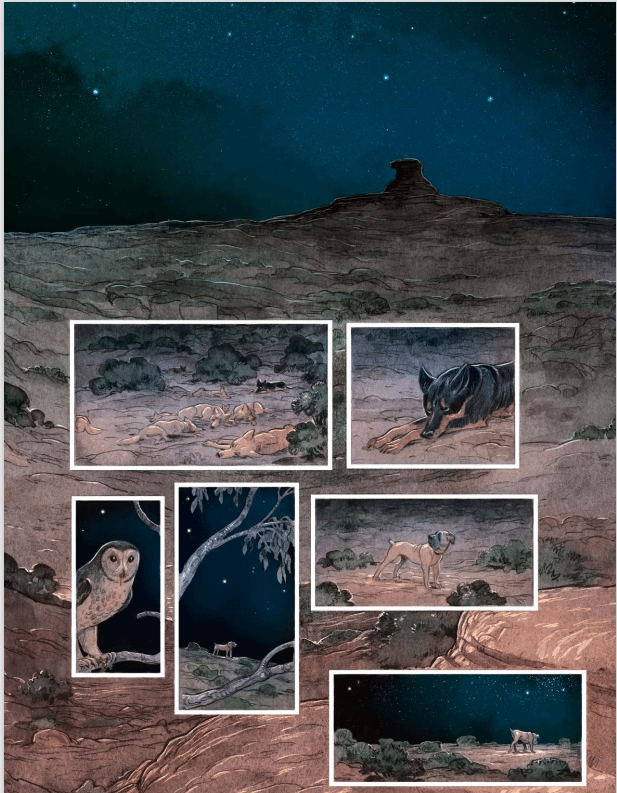 Whilst this contains some show-stopping visuals it could be described as a quick read. Take my advice and spend some time drinking in the panel art before rushing onwards with the story. You will feel that need as there is a palpable sense of jeopardy in this story. The untamed nature of the Australian wilderness makes the reader wonder constantly who will survive the next five minutes. At many moments you second-guess the story and think that the end has come for the titular mastiff as well as the duck-billed platypus who is almost the book’s tragic/comedic placement. As we read we also overlay more humanistic feelings onto the animals present. We imagine a cruelty that isn’t really there and the villains/heroes move into narrative positions. A wordless book that manages so much is so enjoyable to read! But warnings are due as the ending might bring forth a tear.