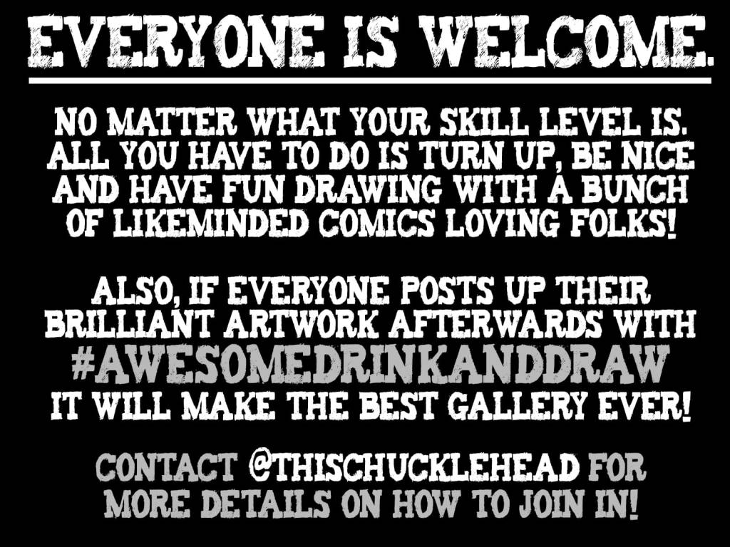 If you are a listener to the best podcast in town and fancy popping along for some comics talk, drawing advice and some occasionally blue language this is the place for you. Don’t worry if you think your ink slingin’ skills ain’t up to snuff all abilities are welcome. There’s also a lot of encouragement in the room and a big love of the comics medium!