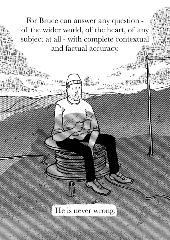 This is a 40 page comic that is split into two stories. First up is the modern quasi-mystical folk tale of a pilgrimage to the scene of an all-knowing talking rock face called Bruce. Once a year on the 18th of May this stone face carved into the side of a cliff will answer four questions.