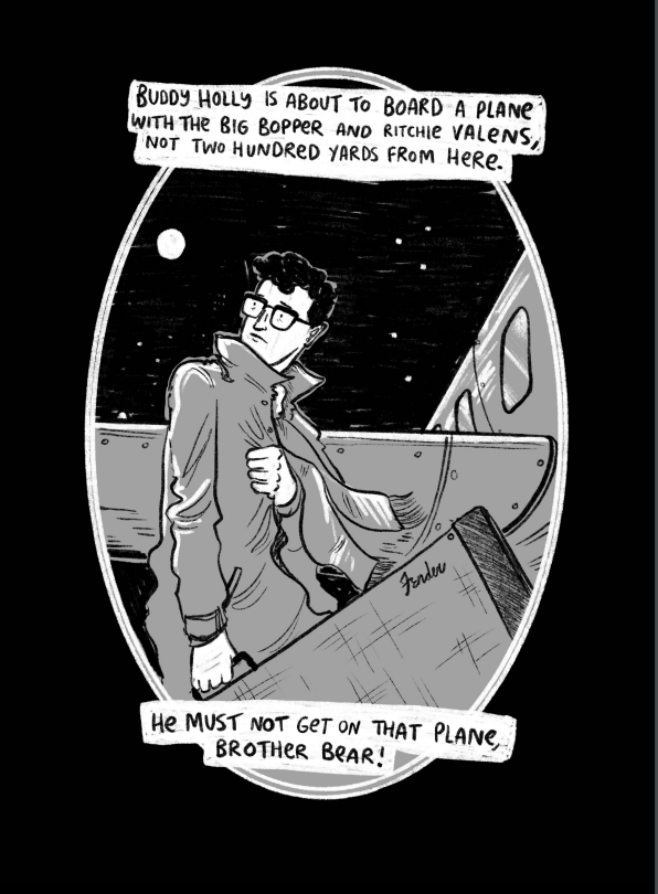 The second story is called ‘Buddy Holly‘ and is an interesting take at what happened to the plane crash that killed this musical legend and others. When I say interesting perhaps what I mean to say is wholly unexpected, downright strange, the product of too much cheese before bed and possibly of a narrative structure the likes of which we haven’t seen since Frank Zappa told his followers of ancient eskimo legends.