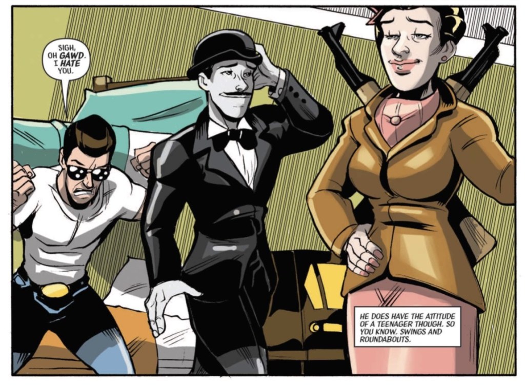 The lettering works ok but there are moments where I found the balloon/panel placement a little intrusive. And the font chosen for the Silent Movie pastiche is a little unreadable when read on the iPad. Certain phrases took a second pass when I was reading and could be reconsidered. For example, when you have a hero called ‘That 90s Guy’ it makes for a mouthful introducing him with a panel that reads ‘That’s That 90s Guy’.