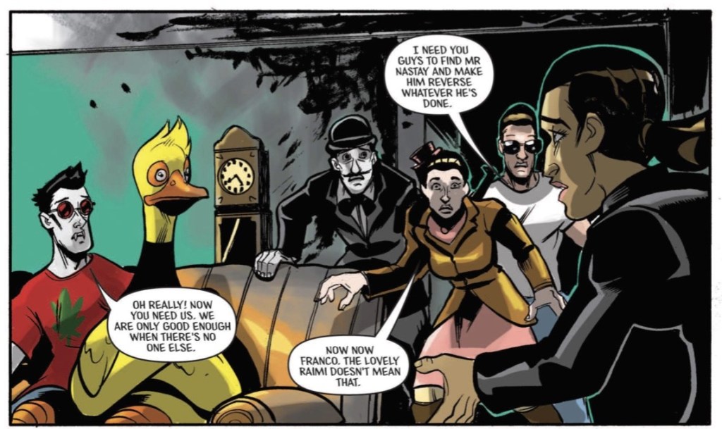 I’d also question the artistic decision to have the revelation of two of the main characters with their backs to the reader. I’m guessing it’s for comedic effect? It doesn’t quite pull this off. But, to be totally fair the comic is unruly and rebellious and often pretty darn funny so maybe this adds to a general mood. Luke and Jim juggle a lot of lunatics and mostly pull it off. The story starts with some great set pieces for example. A hero who lives online and stops cat-fishing weirdos made for a great opener for example. I’d also question the decision to have two white men of a similar age with similar hair and both wearing sunglasses. It wasn’t until my second read that I realised they were different people.