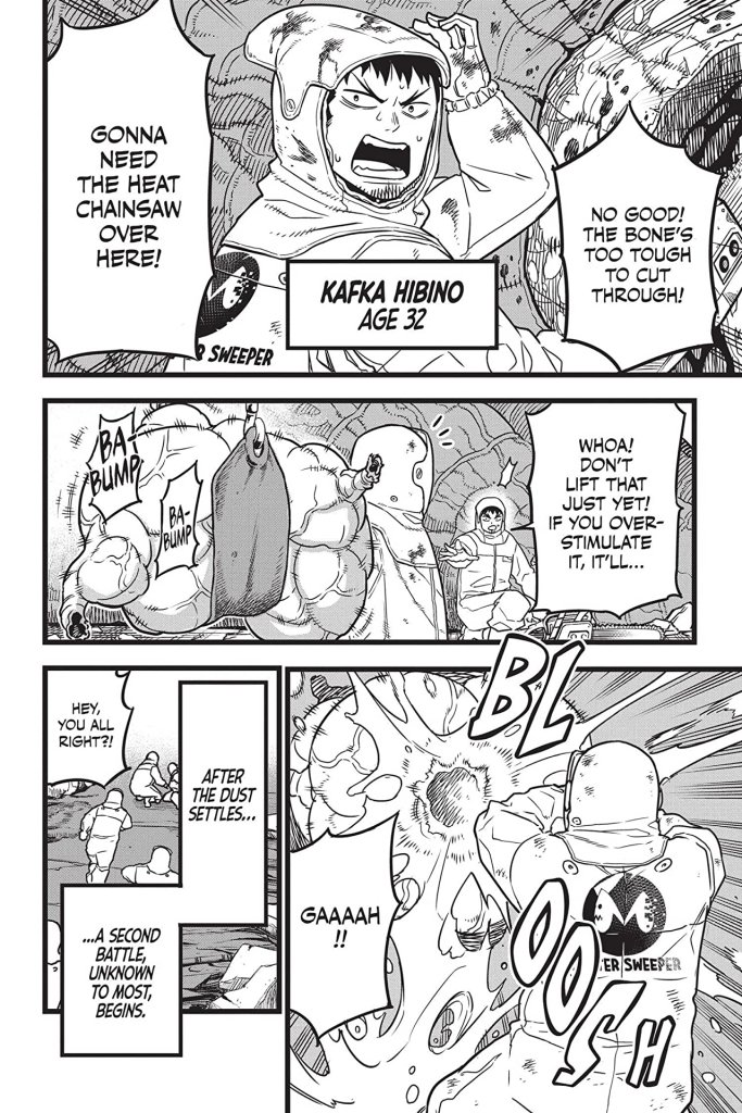 It follows Kafka Hibino (I’m loving the cool names of Manga characters by the way) as he works on the clean-up crew that sorts out the bodies and destruction of beaten Kaiju as they breach Tokyo. He holds an ambition to finally join the ranks of the 3rd Division of the Defence Force. But even the cleaning can be dangerous and he and newbie Rene Ichikawa are attacked and wake up later in the hospital. A strange demon wasp jumps down Kafka’s throat and he develops powers and is named by the TV Crew as Kaiju Number 8.