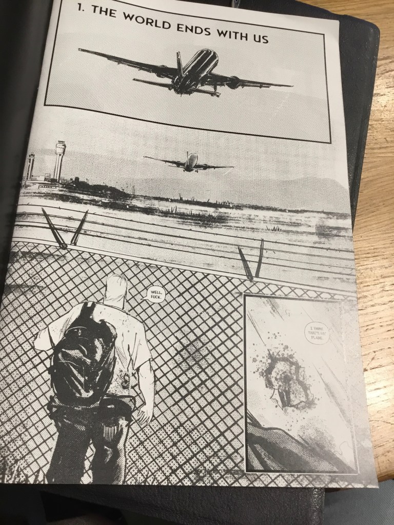 The art is competent and manages to capture a certain noir vibe but fails to show any energy. This may be because of a number of missteps in the pacing and scripting process. I’ll try and elaborate. The story is laid out in chapters and jumps between two (?) times in the life of Mikey. Page 1 ‘The World Ends With Us’ (a misjudged opening title if there ever was one) is just plain dull. The two tops panels show the silhouette of a plane taking off, panel 3 a man swearing ‘Oh Fuck’ and panel 4 shows a blob as a voice declares ‘I think that’s my plane.’ This is actually a gunshot wound. It neither looks like one or is representative of one and had me scratching my head.