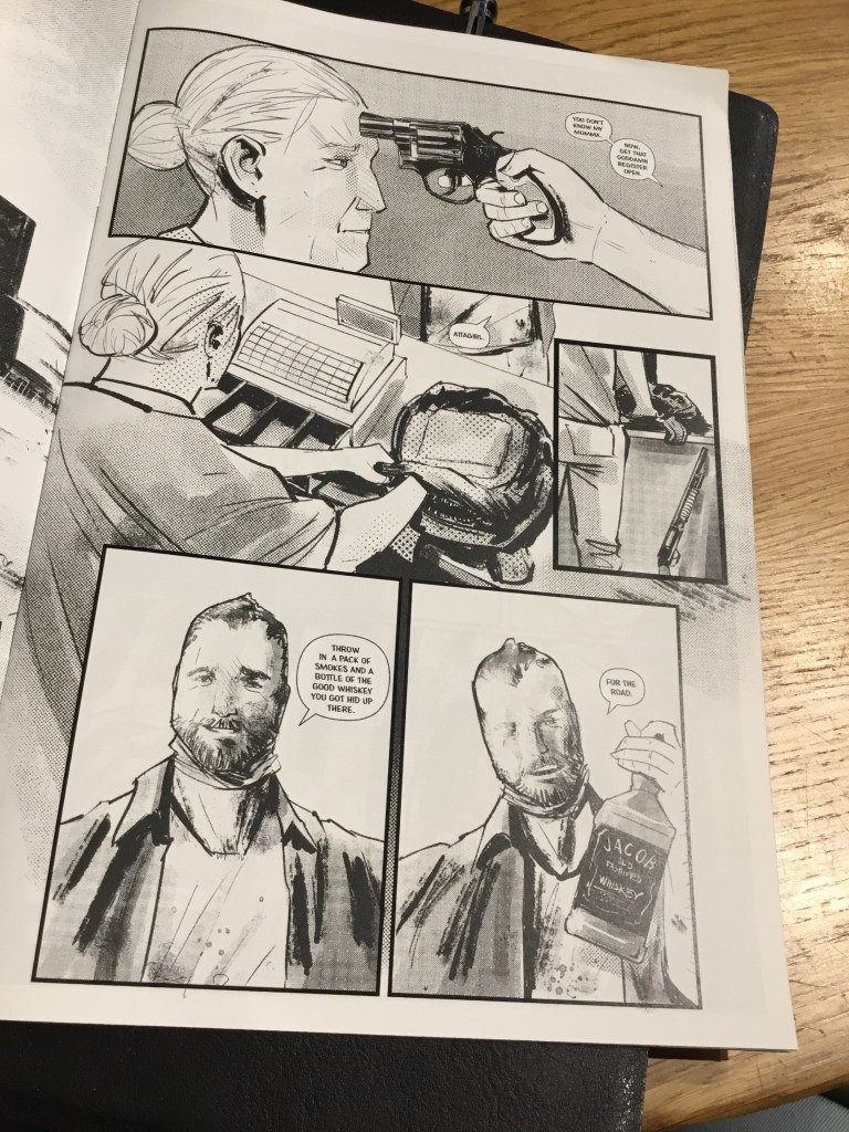 There are also two pivotal moments in the comic where someone is shot. One on page 10 and one on page 16. Neither is shown and both are implicated with the use of an out of panel incident. Why would you do that in a visual medium like comics and especially in a book that otherwise is pretty darn drab and without action. This is a book about armed robberies and the folks who commit them. The only person you see actually firing a gun is a female victim. I’m still uncertain what message the creators are sending with this dynamic. The same goes for a ‘fight’ we see on page 14. It is barely shown and lacks both motion and emotion. It is dry and stiff and boring.