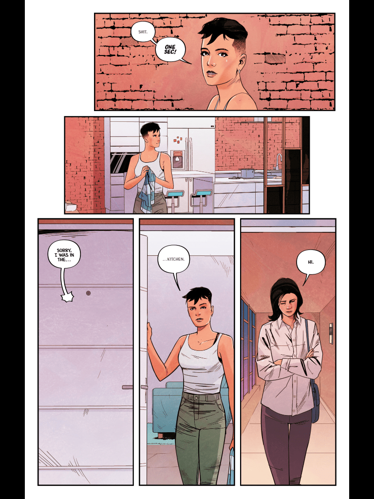 What you then get for around twelve pages is also incredibly decompressed and deals with relationships and family obligations. And it doesn’t change gear in any real way until the last page except for a shot of a docked mech. People slowly move around the space and occasionally say something. This feels like the pacing is really off and makes me wonder if this story was meant to be published in a BD Album or Graphic Novel format.