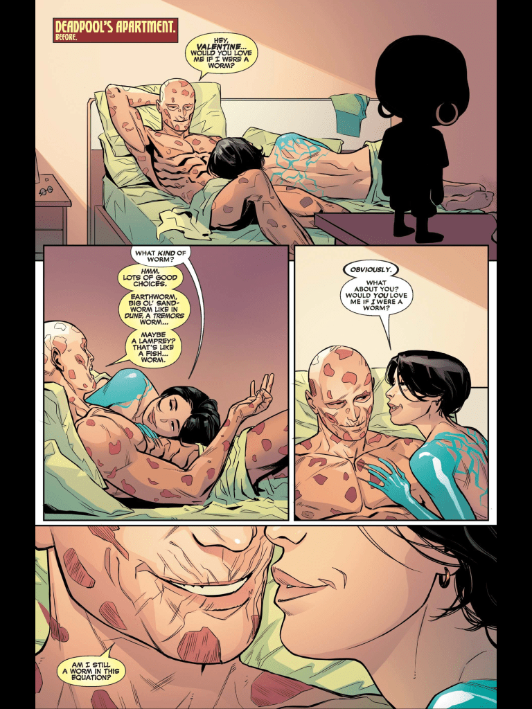 This is incredibly unengaging and feels like it never ends. Numerous characters come and go, who are not Deadpool, that I could give less than two shits about. The dialogue is lazy and drawn out. Artistically this was the poorest of the books I read this morning. I had to double check who I was reading about with this page I have posted below. Still not certain if that is meant to be Deadpool out of costume? Is the head in the lap positioning meant to be titillating? Romantic? It neither works at a first or second read.