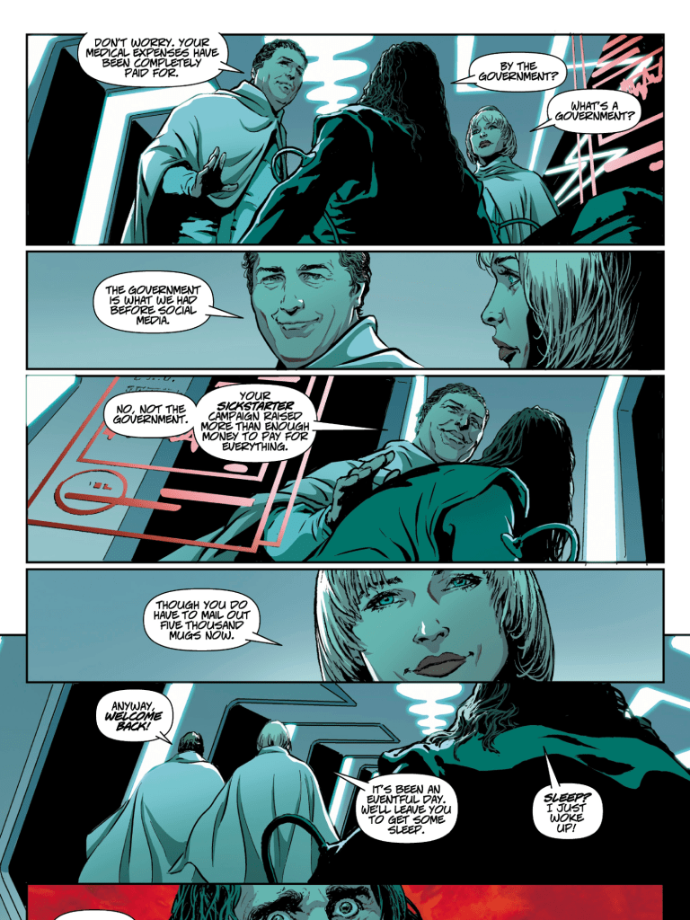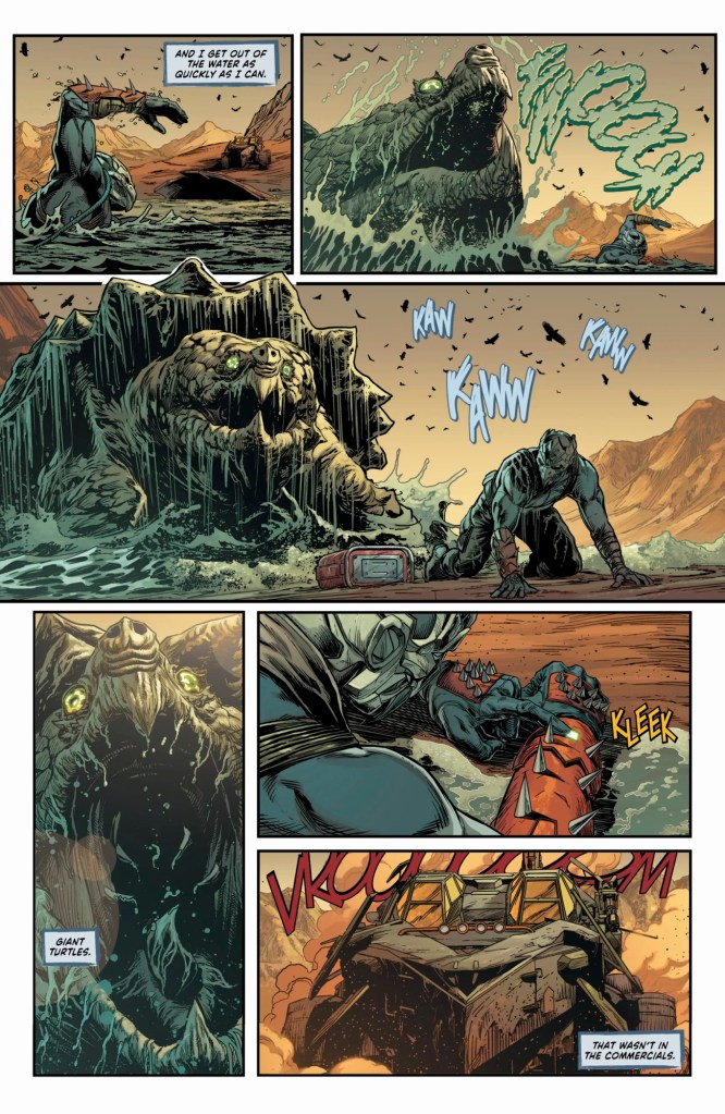 I’m cheating this week as I’ve called the top space a draw between two titles. The first is a brilliantly written satire on social media in a science fiction setting. Death Ratio’d written by Mark Russell who is quietly becoming one of the best in the business. The art by Laci has a realistic flavour and carries the drama along very nicely with a focus on faces and reactions.