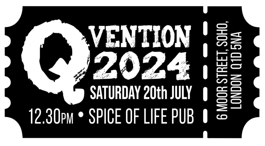 Let’s change the mood. In just a few short days it will be Qvention. The Q himself is now in the country and we will be gathering to talk comics and welcome his good self back to Mother London. All are welcome. But be warned – it’s not really a convention and it is absolutely nothing to do with Q(Anon).
