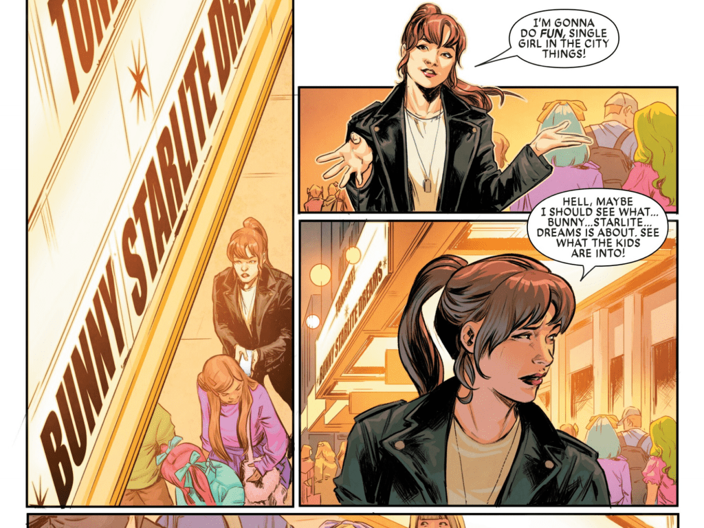 Hey! The Marvel office had a great idea. Why not write a comic where we open on a street scene, turns out our main character works in a bar, she goes for a walk and gets some texts, then she feels a bit tired so has a lay down on the couch. Gets up, watches some TV, talks to the reader, goes out again………
