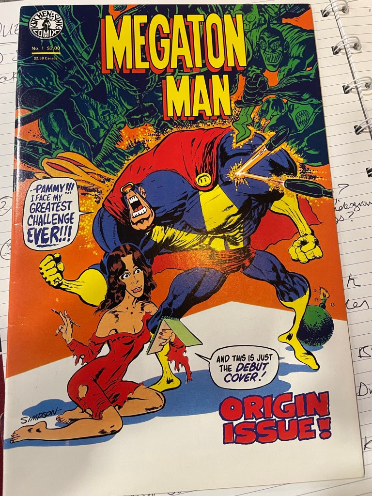It’s great how things turn out. Above is my copy of Megaton Man issue 1 at the exact moment myself, Vince and Dan got the opportunity to ask it’s creator a good hour of questions. Don (Simpson) was pretty candid with his answers and we discussed his early days with Kitchen Sink, his pen name, some Eros Comics and his current Zoop project bringing back his main man. You can have a listen to the interview right here.