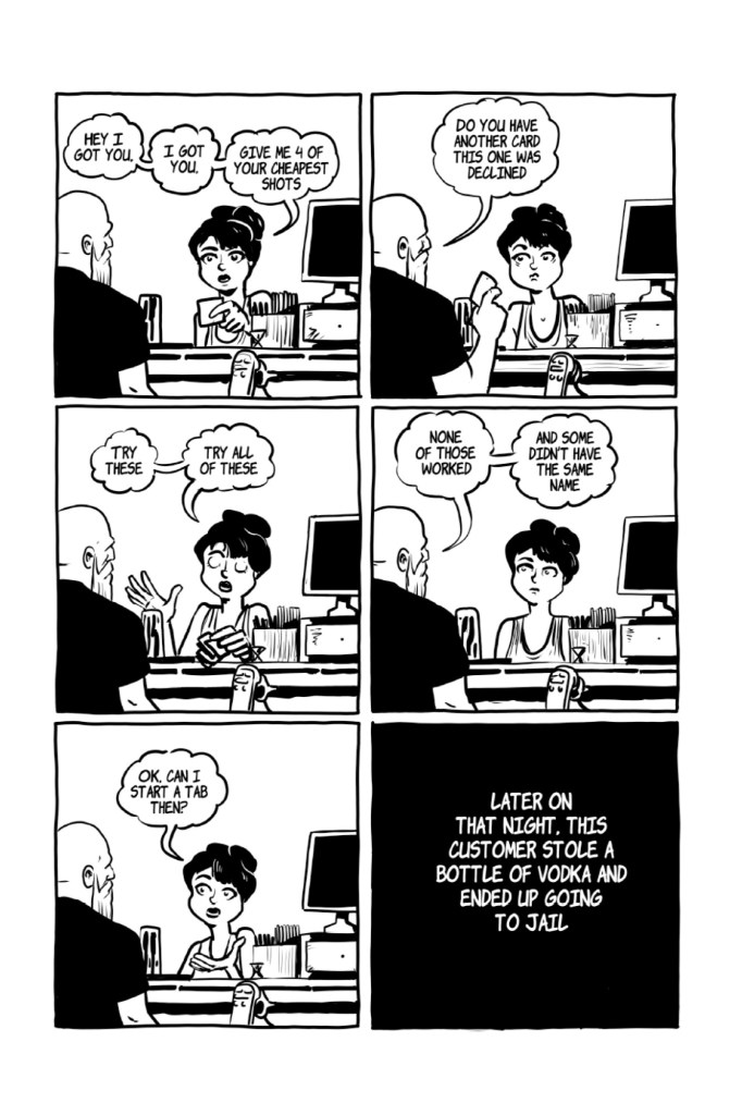 Nothing groundbreaking, just well made autobio one-page short story comics that lean heavily into the gag of workday repitition. They tell of Bryan’s experiences working in a bar with real and imaginary (kinda) customers. Well worth your time.