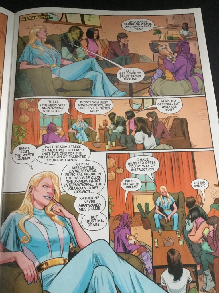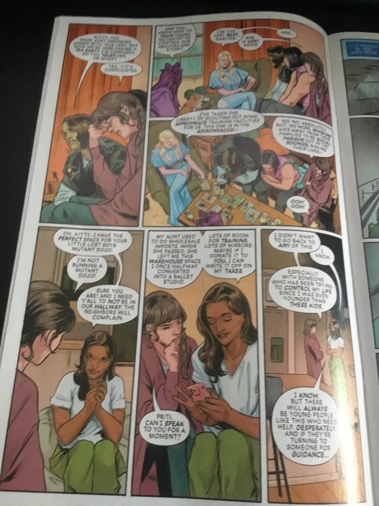 How about some massively overwritten nonsense from the erroneously titled Exceptional X-Men? And then at the end of a hard day battling don’t forget to act out of character in the NYX title and go partying on a strangely sloping/not sloping dance floor …???