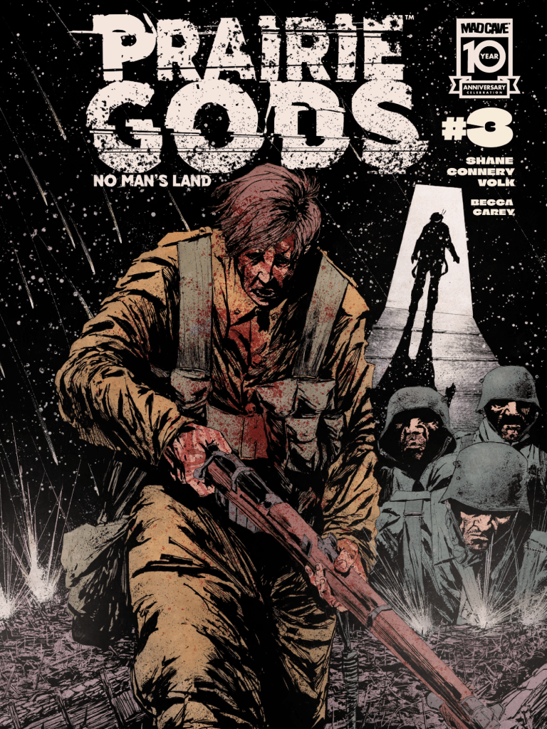 Prairie Gods is a loose anthology series with one character showing up from issue 1 to give a thread of continuity. This particular story has all the feel of a strange seventies sci-if story that maybe somebody like the New English Library would have put out. A soldier laying near death in a Great War No-Man’s Land sees a portal open in the air above him and a space suited space-person looks down on him. It goes to unpredictable places and was a fresh feeling read in an otherwise Big-Two barren weekend new comics landscape. Jump on it if you see it. I also feel that Shane Connery Volk, when he’s not making music, is a writer/artist to keep an eye out for.