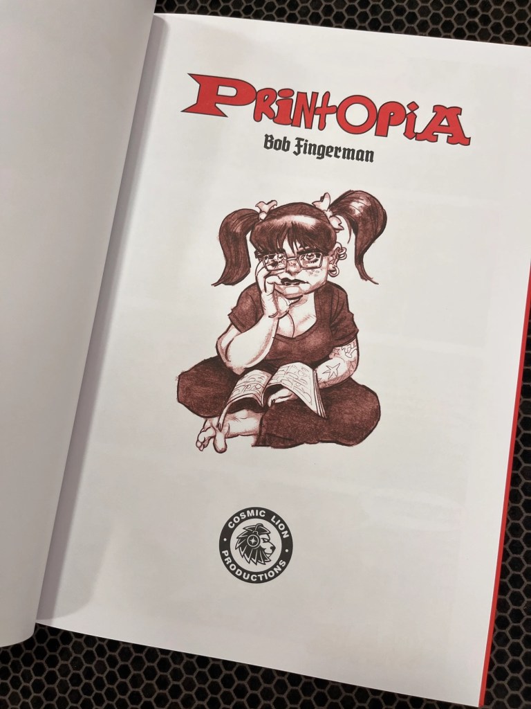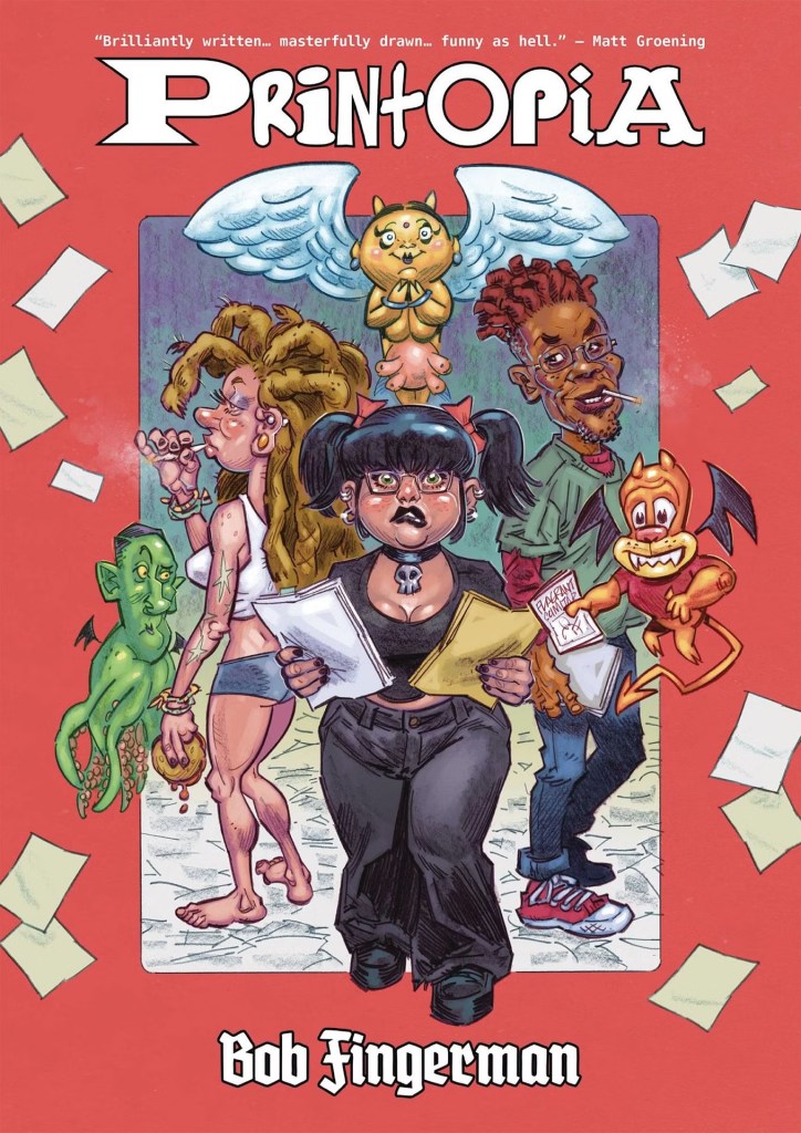 Here’s how the publisher, Cosmic Lion Productions, describes the comic. ‘Printopia, Bob Fingerman’s first all-new graphic novel in over a decade, is a smart, satirical, story set in NYC, featuring a cast of eccentric creators unleashing their visions on the world. Part Ghost World, part acid trip, experience what Matt Groening described as “Brilliantly written… masterfully drawn… funny as hell.”’