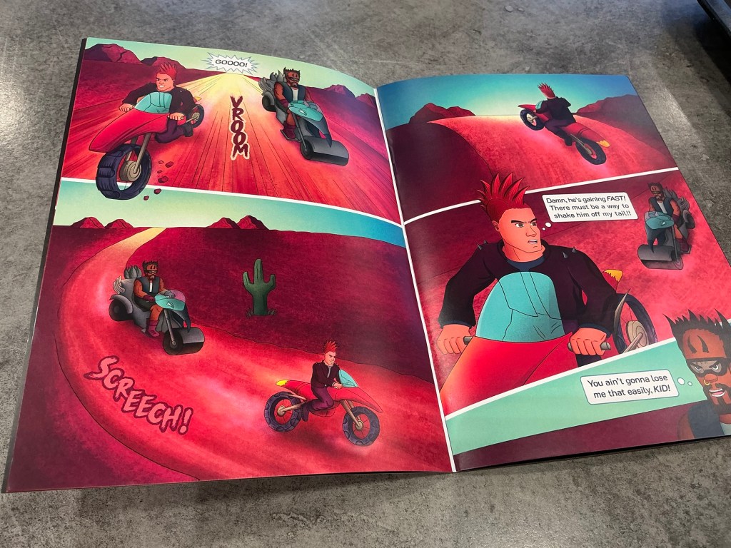 For some algorithmic reasoning I have been bombarded by adverts to this one. The writer/artist following some recommended selling technique of constant reeling. He’s always talking about how he approaches making comics, comparing his characters to popular mangas and at one point even playing his electric guitar. This constant hype building, alongside some VR aspects, got me suspicious enough to ask him if this was all some wind-up. His reply didn’t really make any sense – and in so doing made me even more curious.